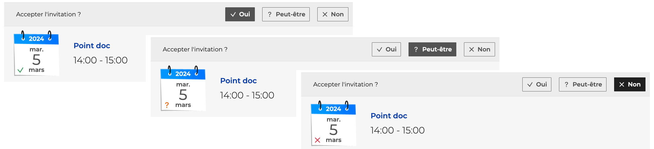 Pour répondre à l'invitation, cliquer sur les boutons Oui, Non ou Peut-être dans la zone "Accepter l'invitation ?". L'organisateur est immédiatement notifié par e-mail.