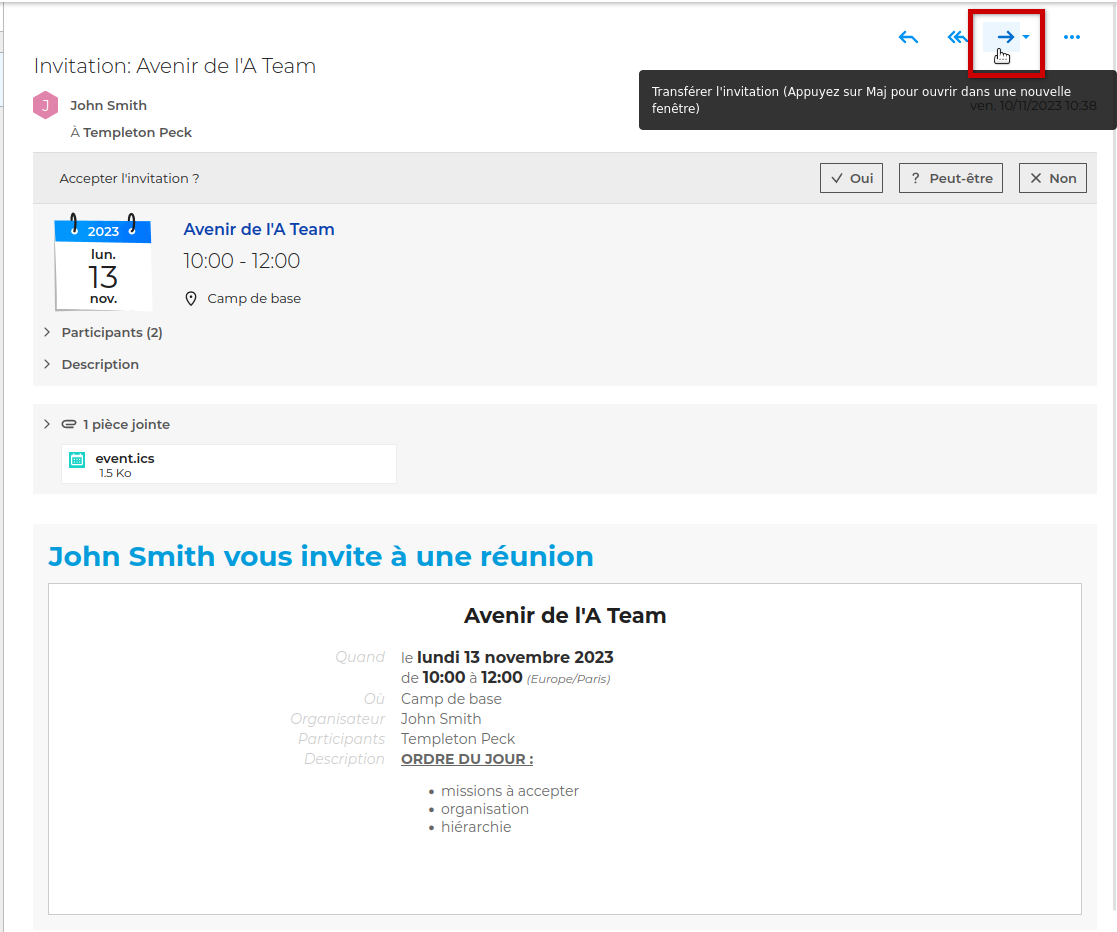 Pour transférer l'invitation depuis la messagerie, utiliser le bouton de transfert habituel :