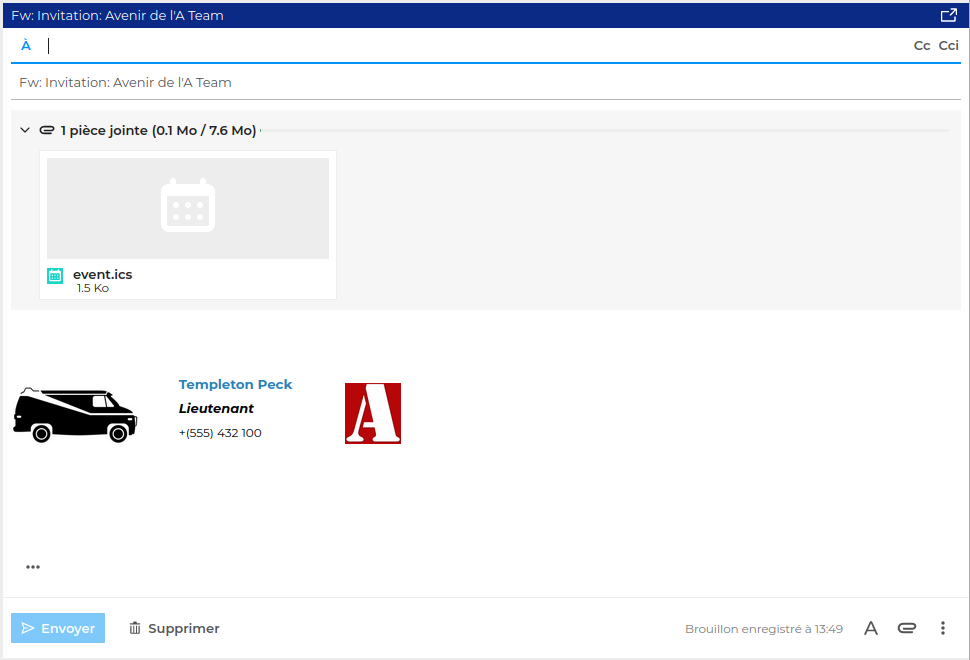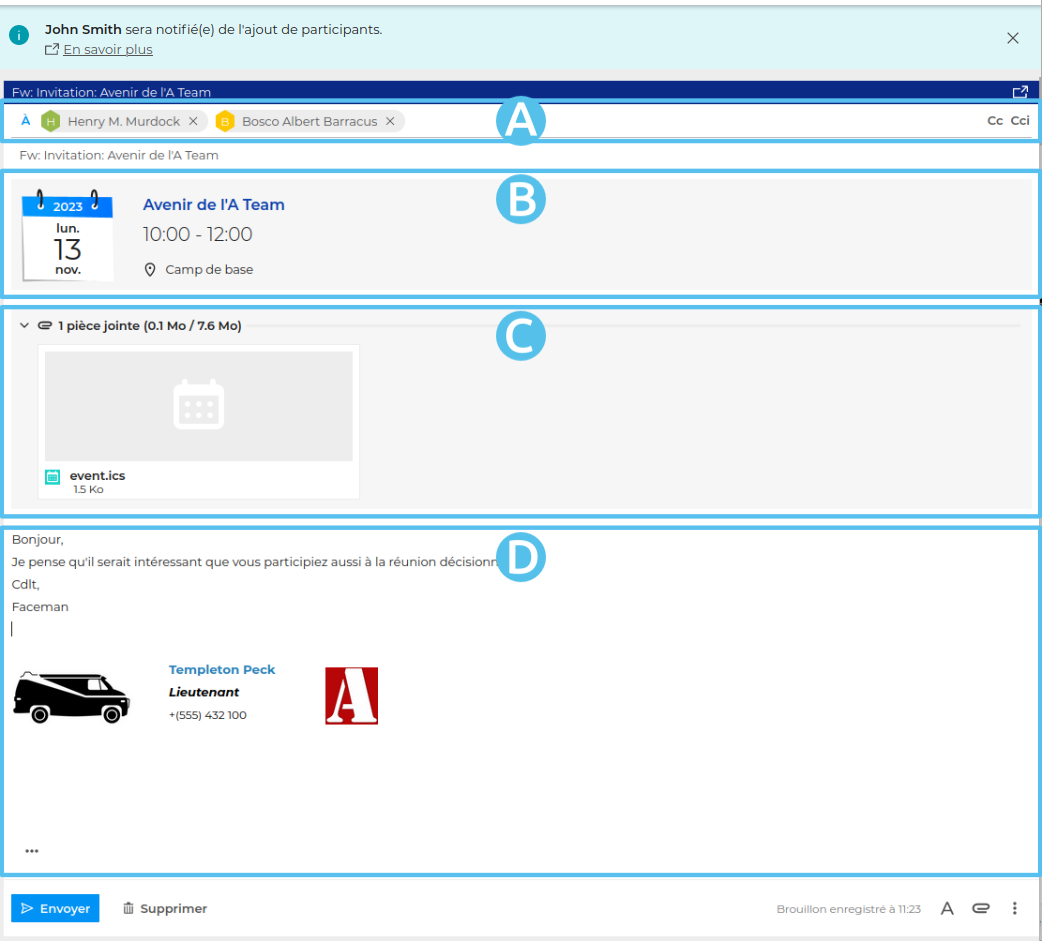 Le composeur s'ouvre alors, présentant un nouveau message dans lequel on retrouve l'invitation et précédé d'un bandeau informant que l'organisateur sera notifié de ce transfert :