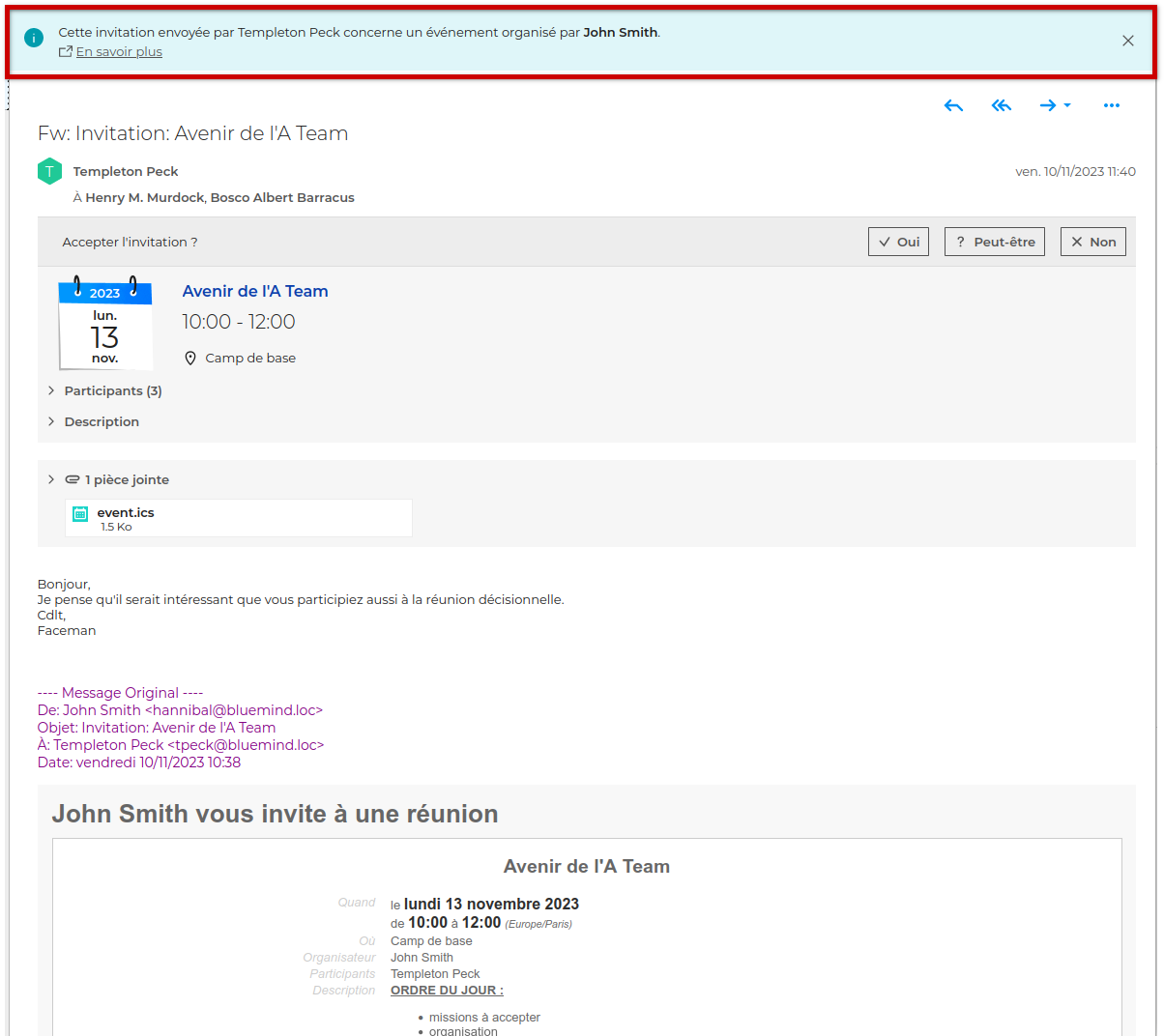 NB : l'information est aussi visible dans la partie "message original" du message transféré - L'organisateur reçoit une notification lui indiquant que son invitation a été transférée et lui permettant d'accepter ou de refuser l'ajout des participants. Il reçoit également les réponses de participation des nouveaux invités.