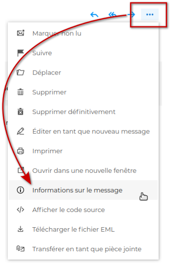 Pour voir des informations détaillées sur le message, ouvrir le menu en haut à droite de la zone d'affichage principale et cliquer sur "Informations sur le message" :