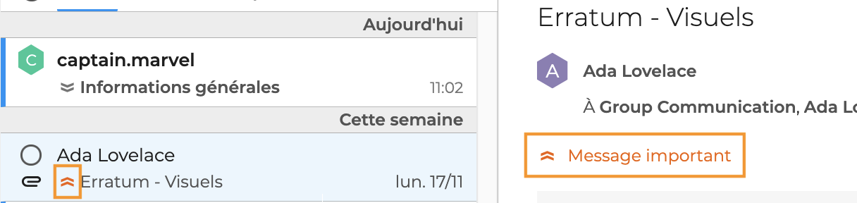 Lorsqu'un message noté comme "important" ou prioritaire" depuis la messagerie BlueMind ou depuis un client lourd proposant cette option, un icône permet de l'identifier rapidement dans la liste des messages et la mention "Message important" apparaît dans son en-tête.