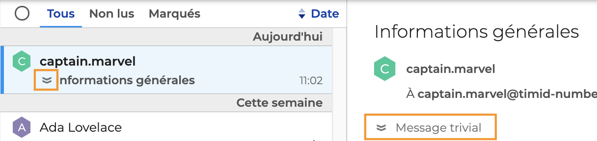 Lorsqu'un message noté comme "non important" ou en "priorité faible" est envoyé depuis un client lourd proposant cette option, l'icône est alors grisé et l'en-tête indique qu'il s'agit d'un "Message trivial"