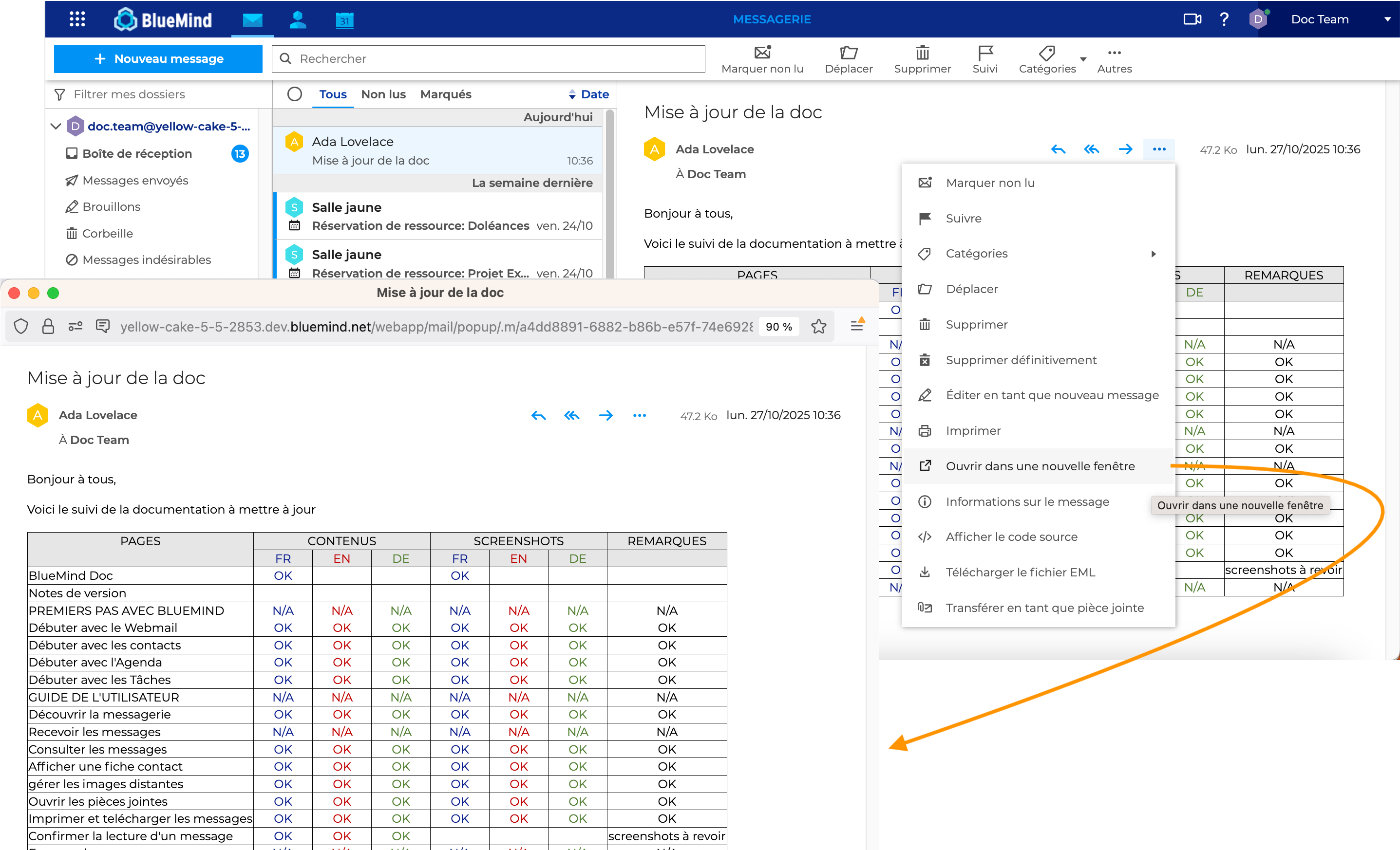 Dans le menu des actions du messages, cliquer sur "Ouvrir dans une nouvelle fenêtre" :