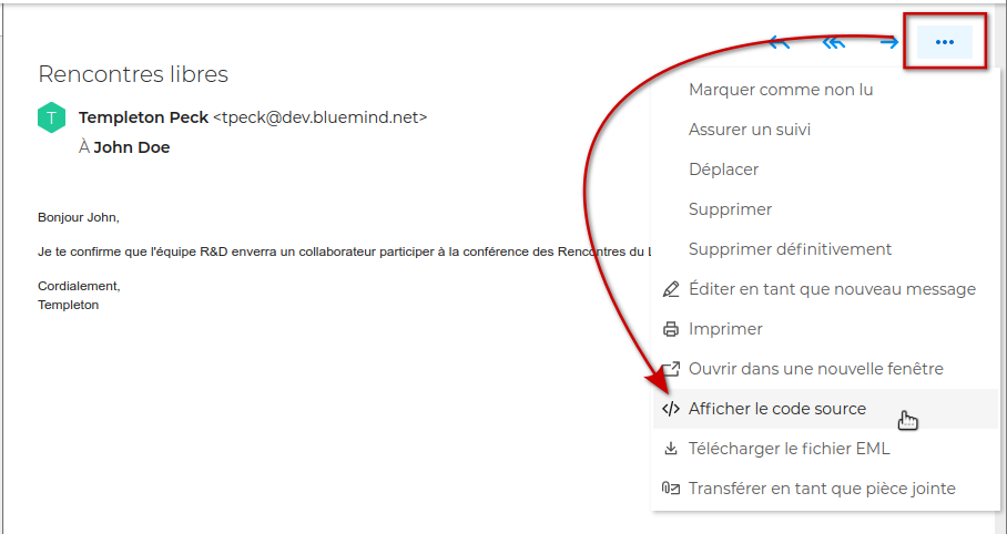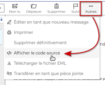 Pour visualiser le code source brut d'un message reçu, ouvrir le menu en haut à droite de la zone d'affichage principale et cliquer sur "Afficher le code source" :