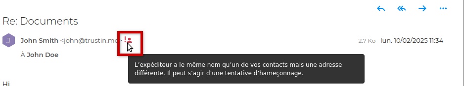 Lorsque BlueMind détecte un expéditeur dont le nom correspond à un contact déjà existant mais dont l'adresse ne correspond pas à celle du contact, une icône rouge et présentant un point d'exclamation est accolée à l'adresse suspecte :