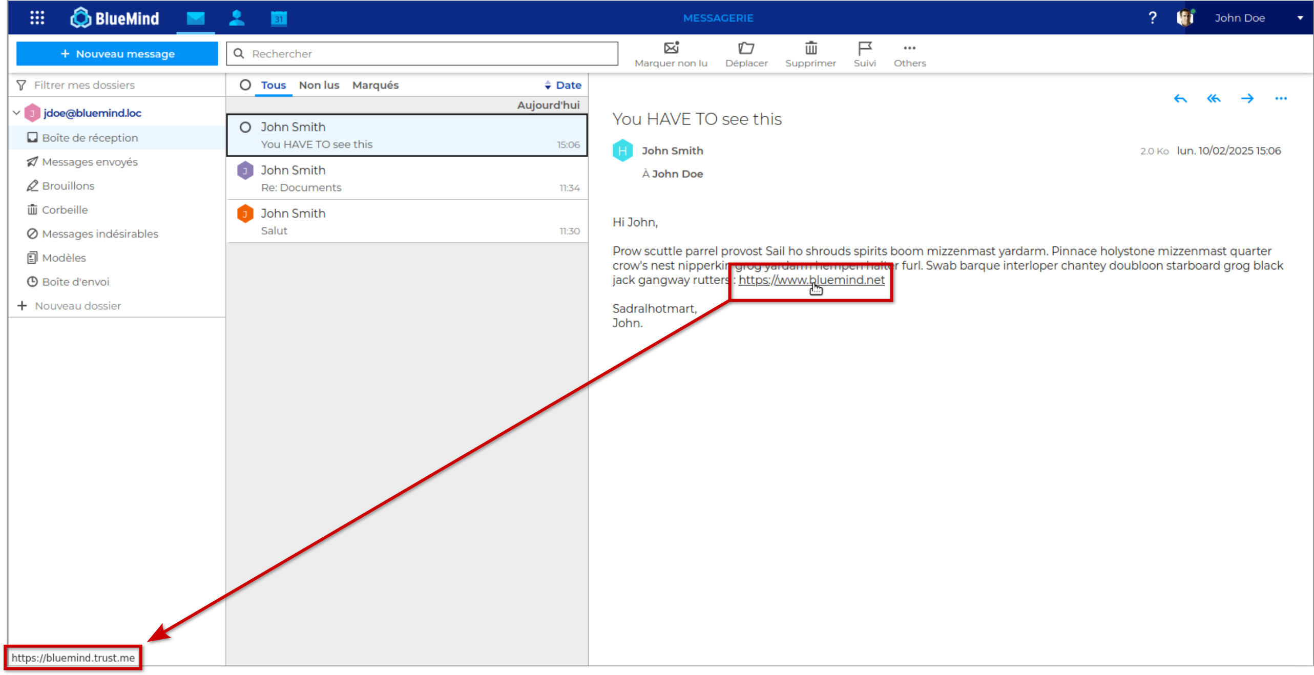 En plus de pouvoir Gérer les images distantes, BlueMind met en œuvre un ensemble de mécanismes afin de lutter contre les e-mails frauduleux. Ces tentatives de hameçonnage (aussi connu sous le nom anglais de phishing) peuvent se présenter sous diverses formes afin d'essayer d'extorquer des informations, voire de l'argent, à l'utilisateur :