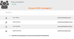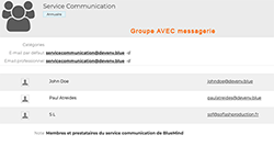 | LES GROUPES D'UTILISATEURS Un groupe rassemble plusieurs utilisateurs avec des besoins ou des objectifs communs. ![]() ![]() | Carnet d'adresses : Les groupes sont créés par l'administrateur et font parties de l'Annuaire On peut : - Organiser une réunion avec ou sans visioconférence et envoyer une invitation à l'ensemble des membres du groupe - afficher l'agenda de l'ensemble des membres du groupe - Créer et envoyer un message à l'ensemble des membres d'un groupe avec une adresse mail, ceux-ci reçoivent alors les messages sur leur adresse mail nominative. On ne peut pas : - envoyer d'e-mail aux membres d'un groupe sans adresse mail |