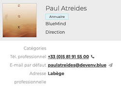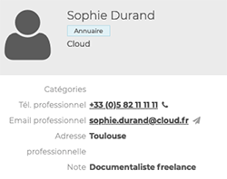 Il est également possible d'envoyer un message ou d'appeler un contact directement depuis sa fiche, d'indexer les contacts avec les catégories, de créer des listes de distribution, de partager les contacts entre groupes ou utilisateurs ainsi que d'accéder à un carnet d'adresses d'entreprise.