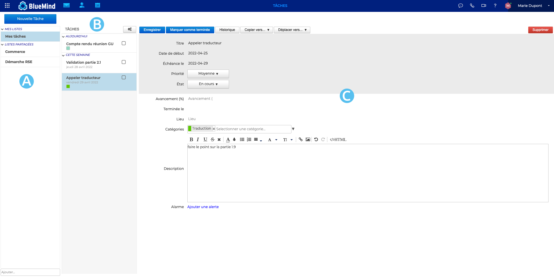 Il est possible d'organiser ses tâches par listes et d'utiliser les tags partagés avec les applications Contacts et Agenda de BlueMind.