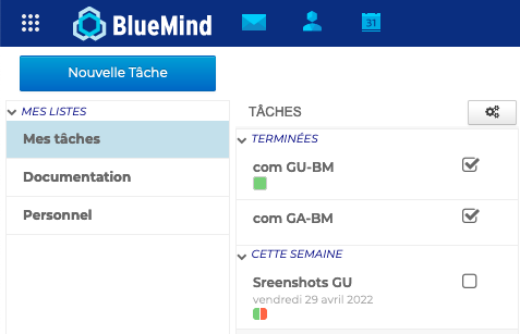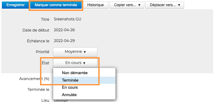 - Depuis le formulaire d'édition en cliquant sur "Marquer comme terminée" ou en sélectionnant "Terminée" dans la liste déroulante du champ État