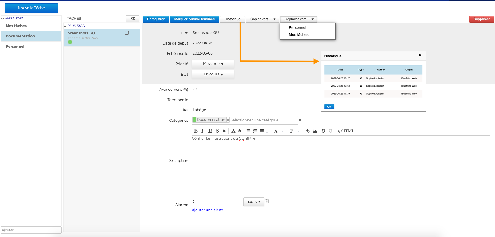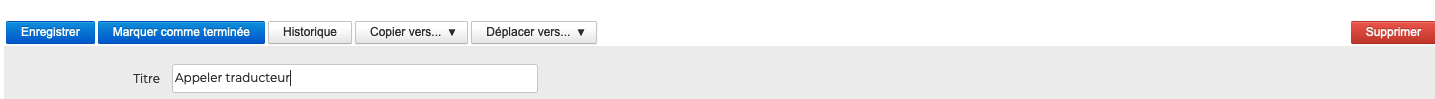 Apporter les modifications souhaitées, de la même façon que lors de la création de la tâche et cliquer sur "Enregistrer. Utiliser la barre d'actions pour voir l'historique de la tâche, la copier ou la déplacer.