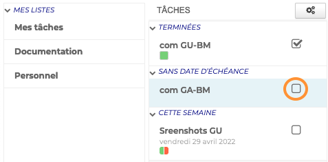 Toutes les tâches terminées sont visibles dans l'application, classées par liste de tâches et sous le statut "Terminées". Décocher pour enlever le statut "terminée"