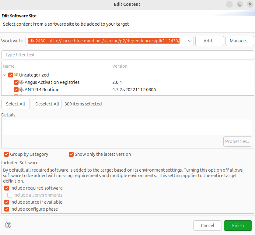La plateforme d'exécution Eclipse doit-être complétée avec les dépendances de BlueMind :
