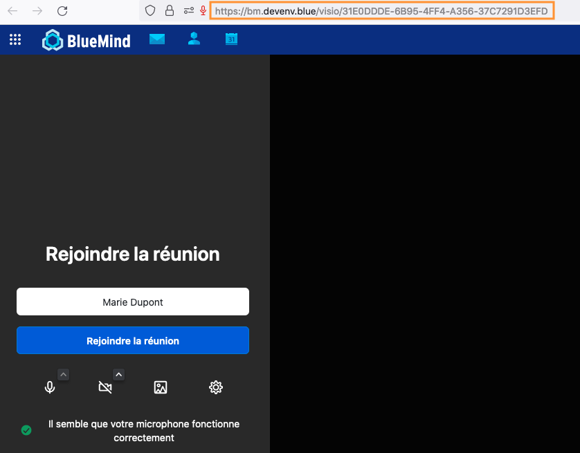 Une fois la page de visioconférence ouverte, copier le lien affiché dans la barre d'adresse du navigateur pour l'envoyer aux participants par e-mail, chat, etc. :