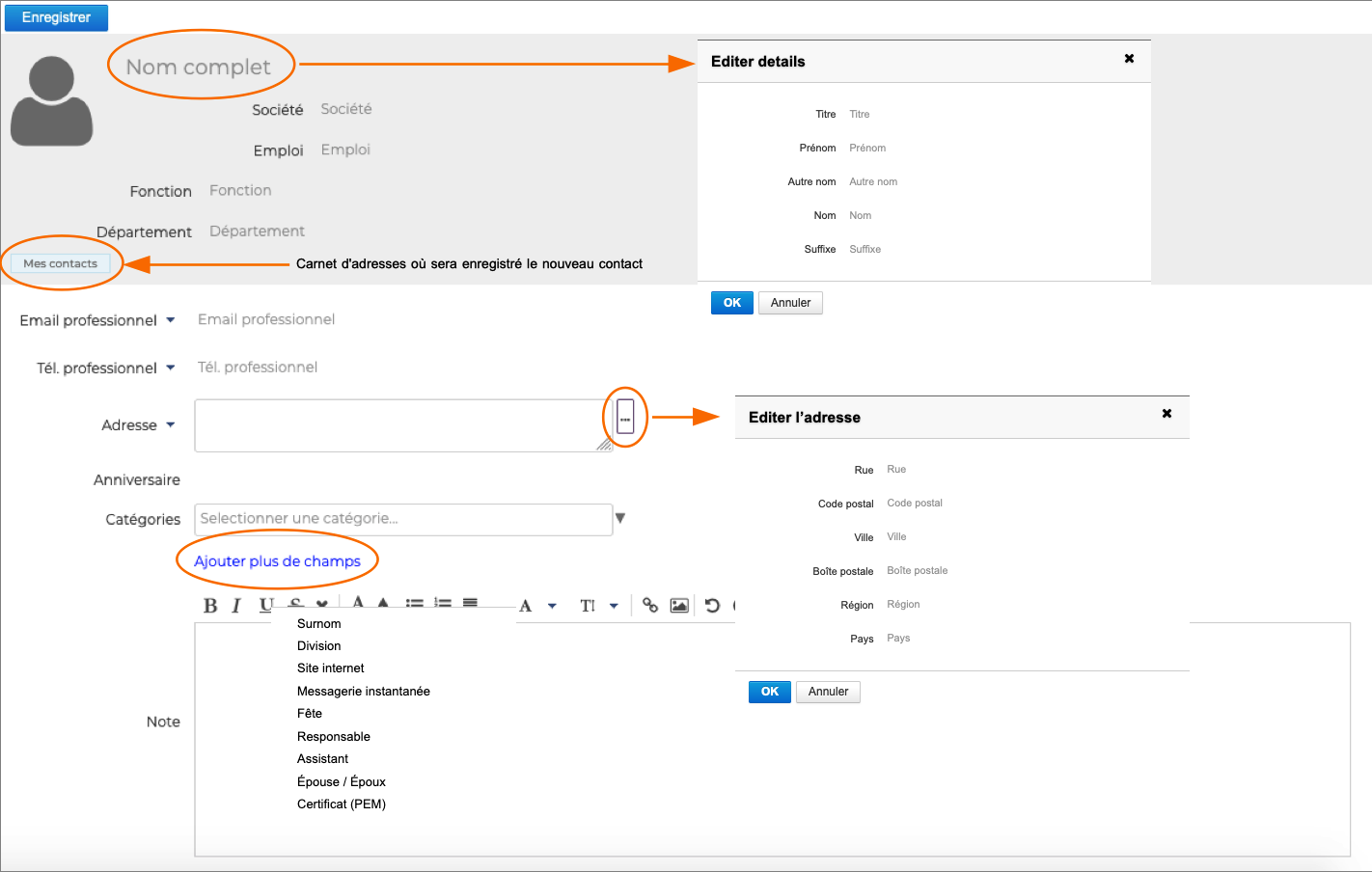 Remplir les champs désirés puis cliquer sur "Enregistrer". Le contact est créé dans le carnet en cours de consultation.