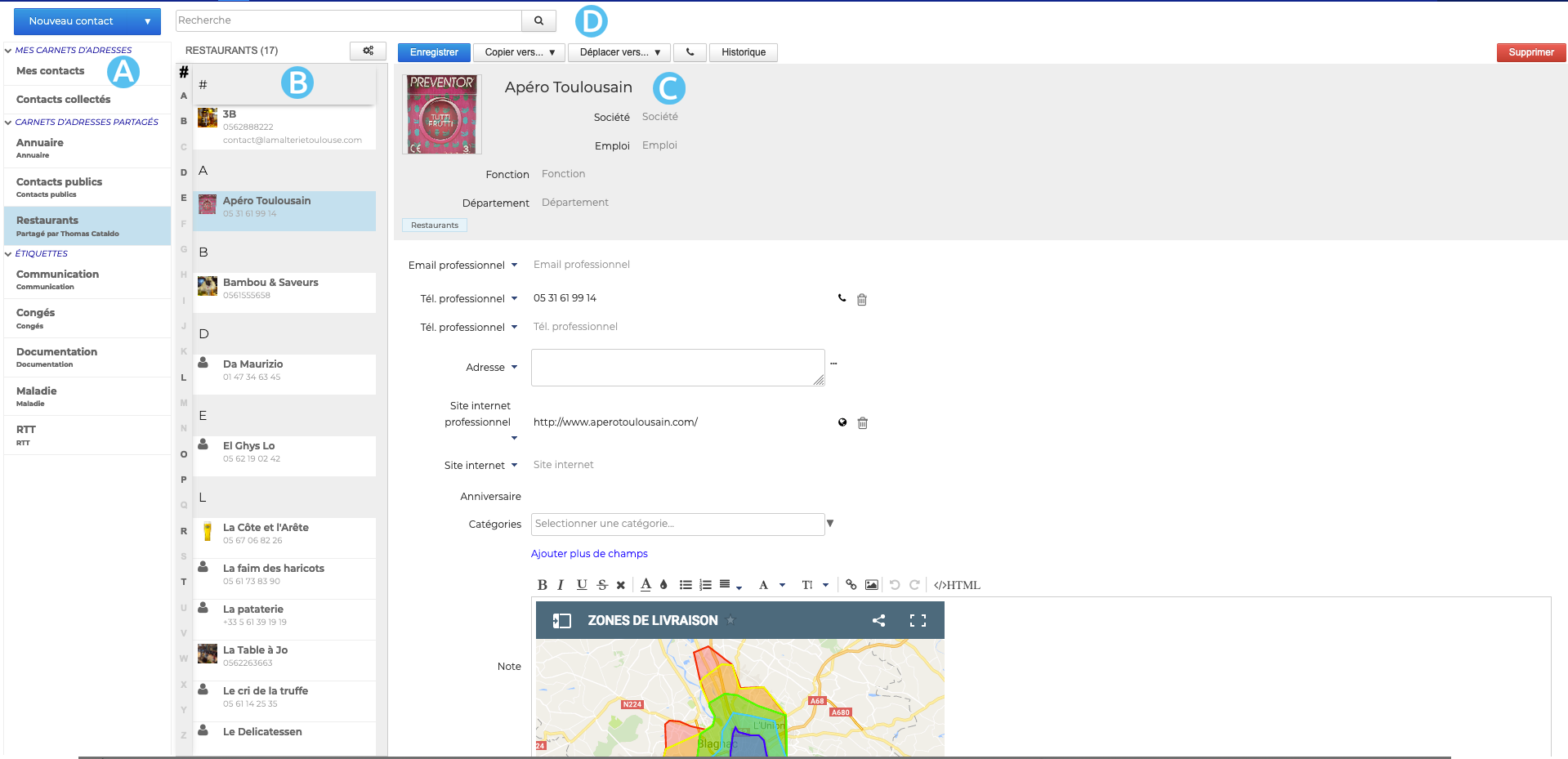 • : dans la 1ère colonne se trouve, sous le bouton «Nouveau contact», la liste des carnets accessibles par l'utilisateur : ses carnets d'adresses par défaut, ses carnets personnels ainsi que ceux qui lui ont été partagé et auxquels il est abonné ;