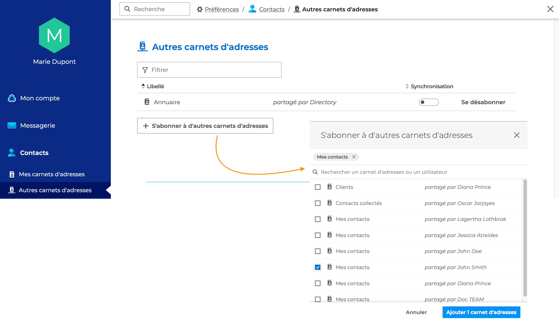 Pour plus d'informations sur les carnets d'adresses partagés, consulter la page Utiliser un carnet d'adresses partagé