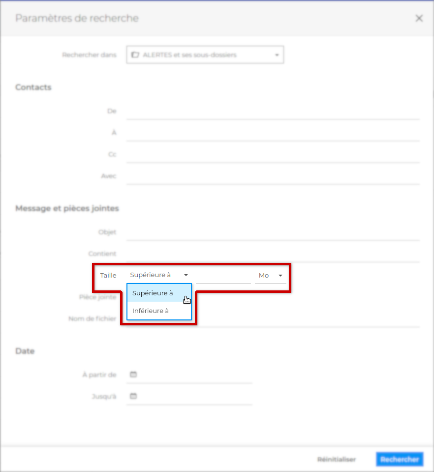 En plus du tri par ordre ascendant ou descendant dans la liste des messages, il est maintenant aussi possible de Rechercher dans les messages en fonction de leur taille :